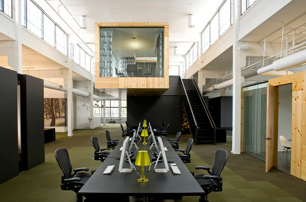 Entre os escritórios mais conservadores da lista esta o da North Publicidade por Skylab Architecture. O elemento mais notável do ambiente de trabalho é a sua sala de reuniões de segundo nível, que se projeta sobre o escritório. Ele fornece uma visão clara do o espaço de trabalho abaixo.