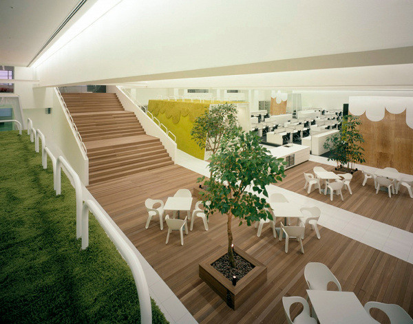 A TBWA Hakuhodo agência de publicidade queriam transmitir o recado: “Nós pensamos de forma diferente”. Daí uniram-se com Klein Dytham Architecture para dar forma a esta mensagem, criando um dos mais bonitos, lúdicos e relaxante escritório ambientes no mundo. Nos vários níveis há lugar para pista de boliche e campo de golfe. O próprio escritório é tão divertido quanto qualquer coisa no prédio: a iluminação indireta e o espaço aberto promove a idéia de casualidade, dentro do corporativo.